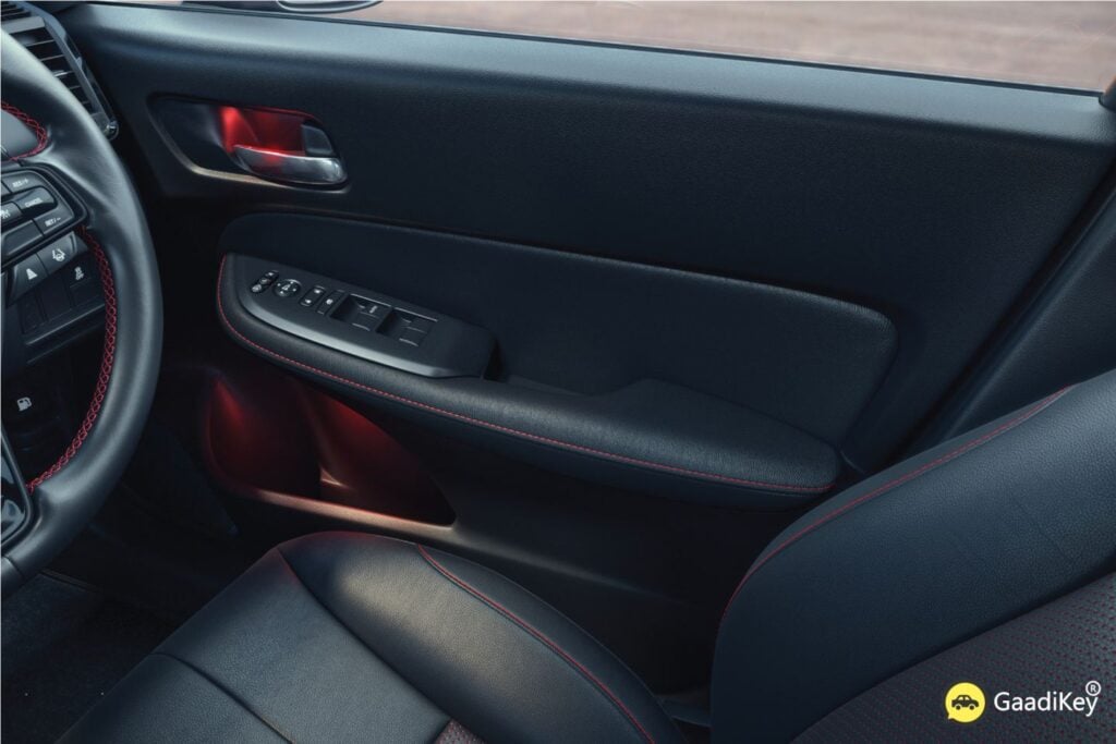 Premium Interiors: All-black cabin with red stitching, ambient lighting, and glossy black accents.