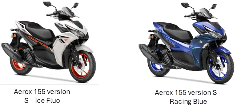 Yamaha has launched two striking new colors for the Aerox 155 Version S: Racing Blue and Ice Fluo Vermillion, along with refreshed graphics. The Metallic Black option remains available in the standard variant.