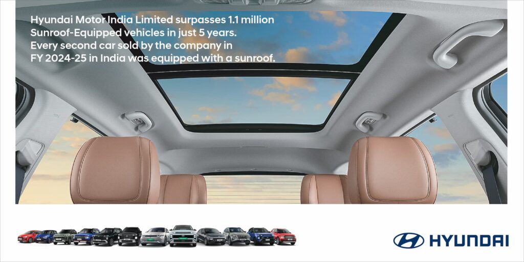 Hyundai Motor India Limited (HMIL) has achieved a remarkable milestone, selling over 1.1 million sunroof-equipped vehicles in just five years. This achievement highlights India’s growing appetite for premium, feature-rich cars, with every second Hyundai sold in FY2025 featuring a sunroof.