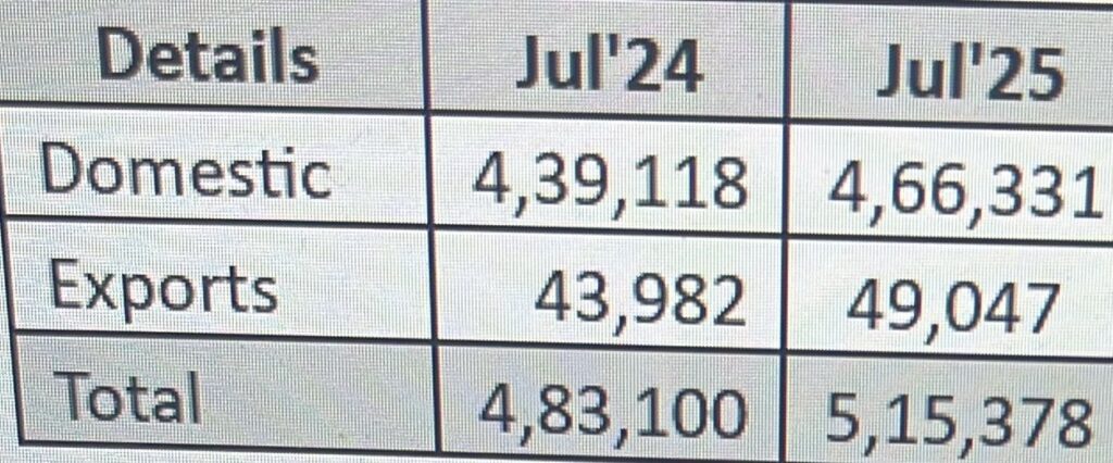 - Domestic Sales: Domestic sales reached 4,66,331 units in July 2025. This represents approximately 6.20% year-on-year growth over the 4,39,118 units sold domestically in July 2024.