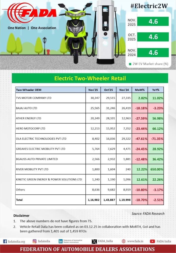 The electric two-wheeler segment, typically the volume driver for the industry, faced headwinds in November 2025. Total retail sales stood at 1,16,982 units, marking a decline of 18.70% compared to the previous month (October 2025) and a slight dip of 2.51% year-on-year.