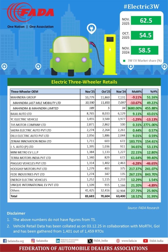 The electric three-wheeler segment remains the most electrified sector in the Indian auto industry. In November 2025, the segment achieved a remarkable market share of 62.5%, up from 54.5% in October.