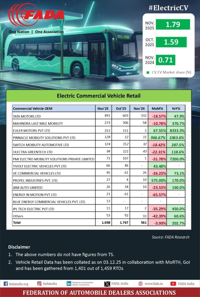 Total retail sales stood at 1,698 units in November 2025. The market penetration for electric CVs rose to 1.79%, up from 0.71% in November 2024.