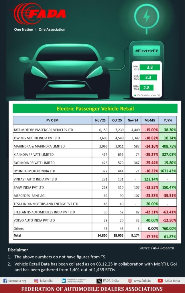 Total EV car sales for November 2025 were 14,850 units, with EV market share climbing to 3.8%, up from 2.8% in November 2024.