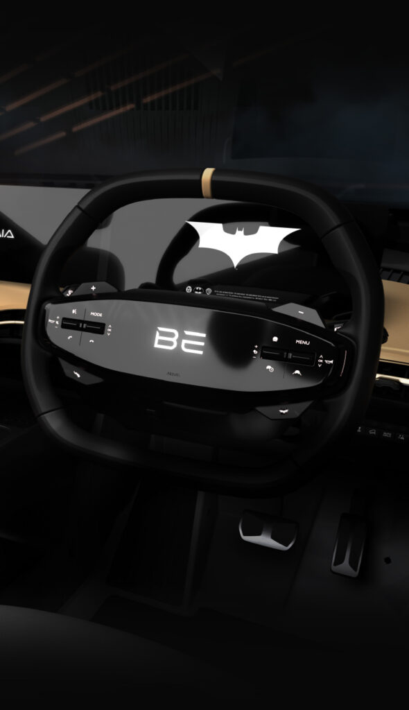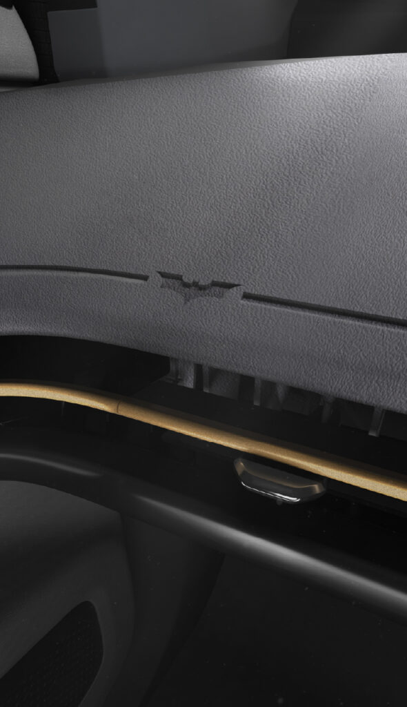 - The Bat emblem is embossed on the “Boost” button, seats, interior labels, and features as a pinstripe graphic running across the passenger dashboard panel.