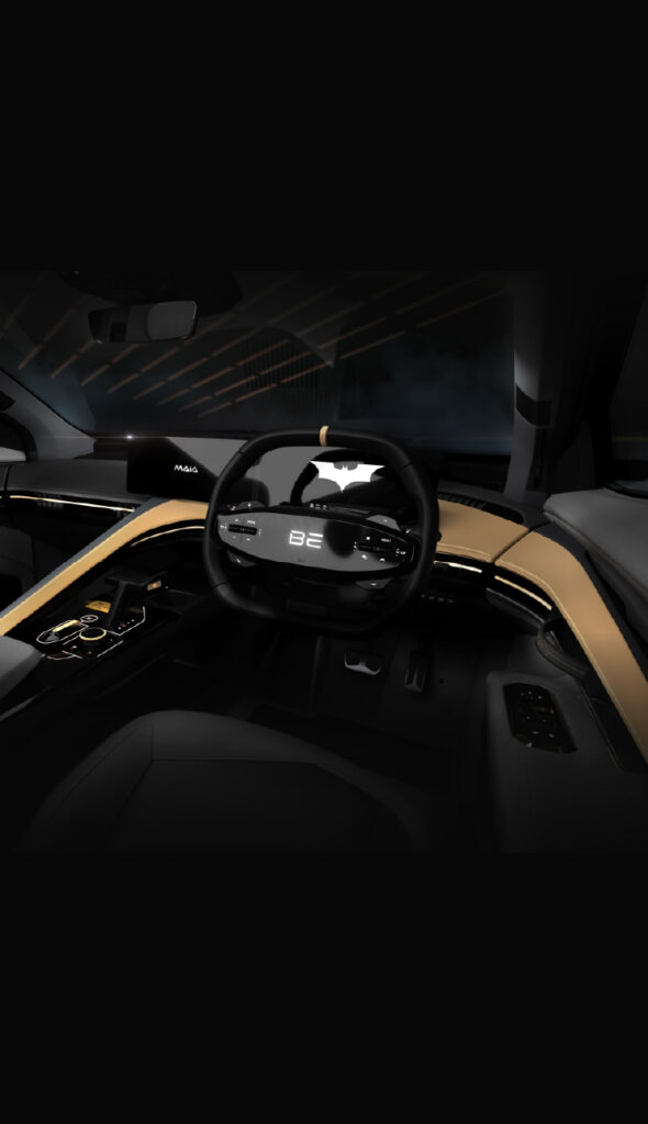 - The instrument panel is wrapped in charcoal leather and features a brushed gold halo surrounding the driver’s cockpit.