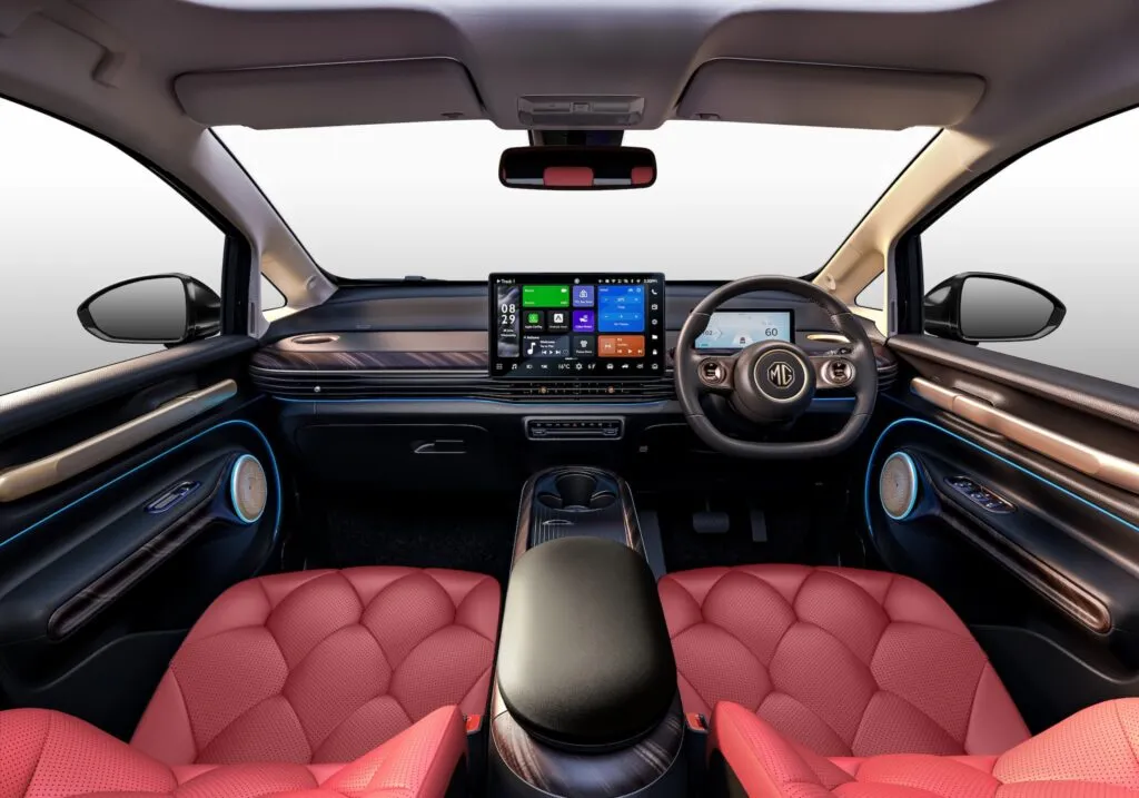 - Upholstery: The cabin is finished in premium dual-tone Sangria Red and Black leather upholstery.