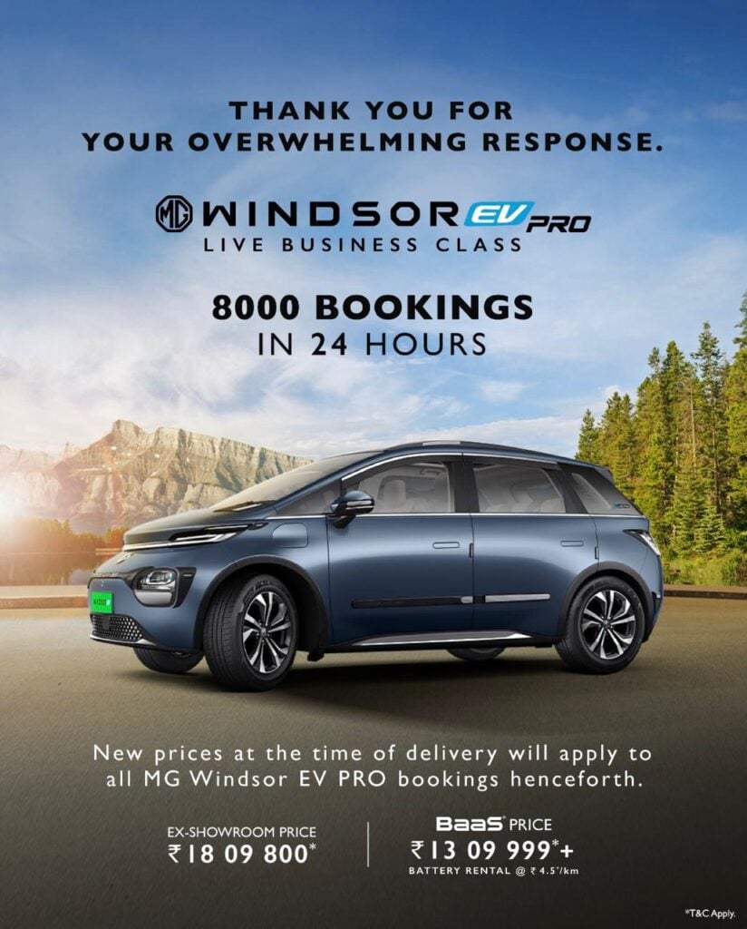 JSW MG Motor India today announced that its recently introduced Windsor PRO has secured 8,000 bookings within 24 hours of its launch. The car will now be available at a BaaS price of INR 13.09L + INR 4.5/km. and Ex-Showroom price of INR 18,09,800.