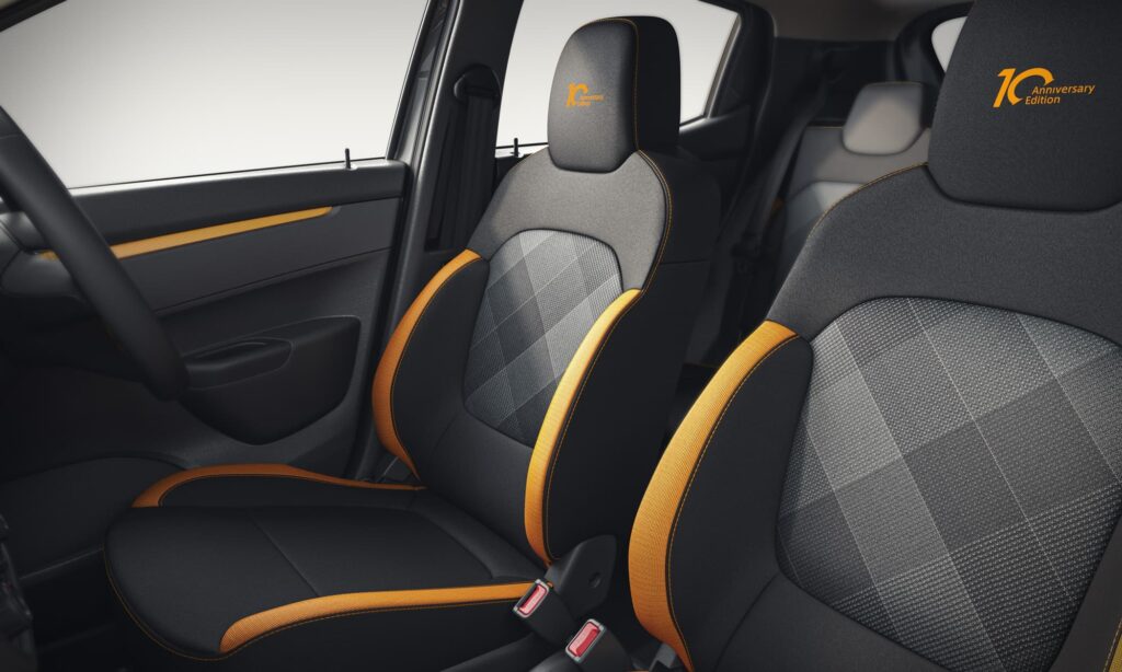 Inside, the cabin is elevated with a 10th Anniversary-themed seat design and premium detailing. Yellow accents on the seats, a leatherette steering wheel with metal mustard stitching, and illuminated scuff plates add a youthful flair and celebrate the special character of this edition.