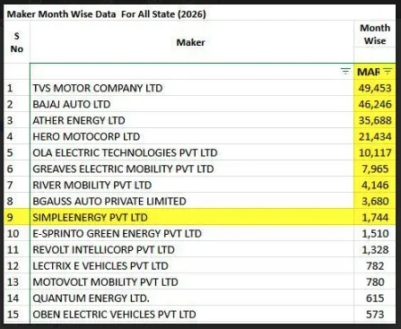 What were Simple Energy’s total sales in March 2026 according to Vahan data? As per March 2026 data from the Vahan portal on EV 2-wheeler, Simple Energy recorded its highest-ever monthly sales, registering 1,744 units across India (excluding Telangana).