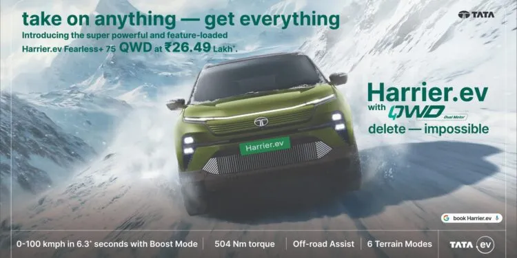 On March 21, 2026, TATA.ev announced the launch of the all-new Fearless+ QWD 75 persona for the Harrier.ev. This introduction allows buyers to access the dual-motor Quad Wheel Drive technology at a more attainable starting price of Rs 26.49 Lakh (ex-showroom).