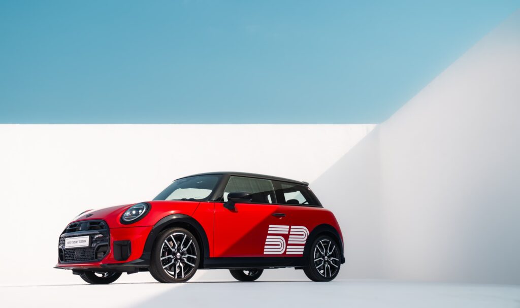 - Bespoke Badging: A white trim stripe extends from the bonnet to the roof and rear, alongside a white “52” graphic on the doors and a “1965” sticker on the C-pillar to honor the historic victory.