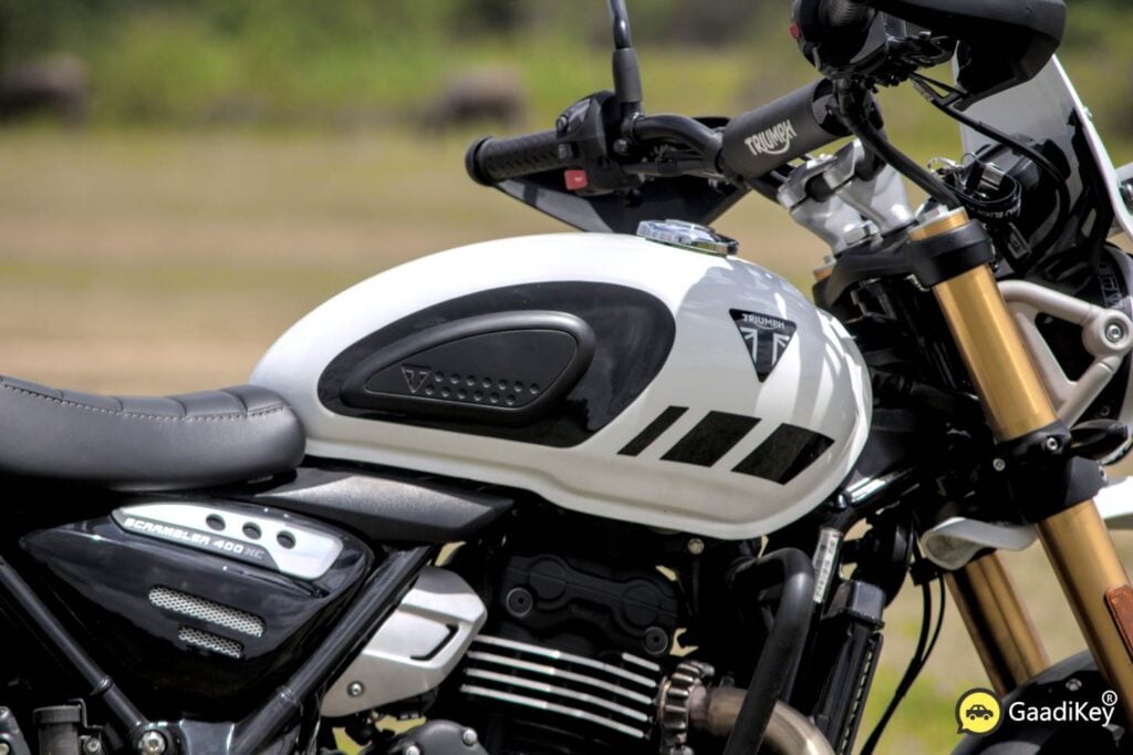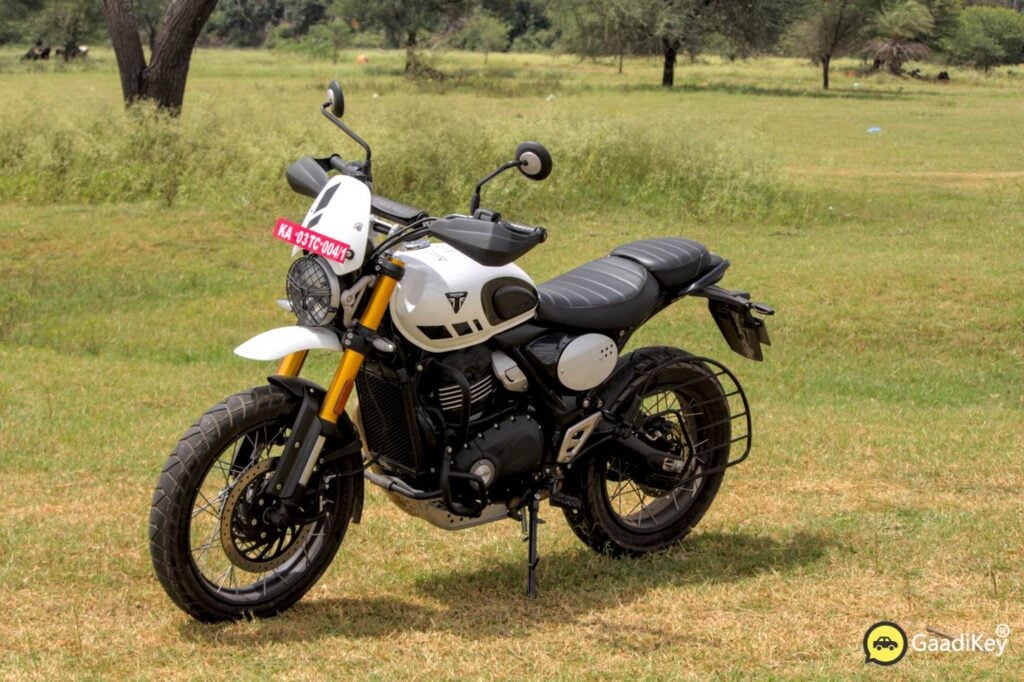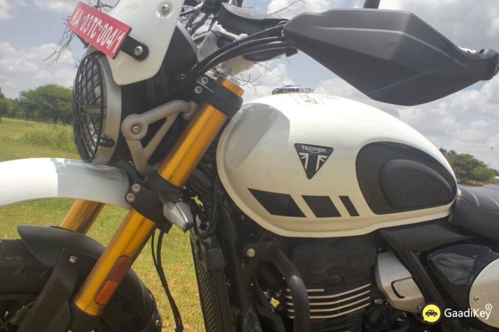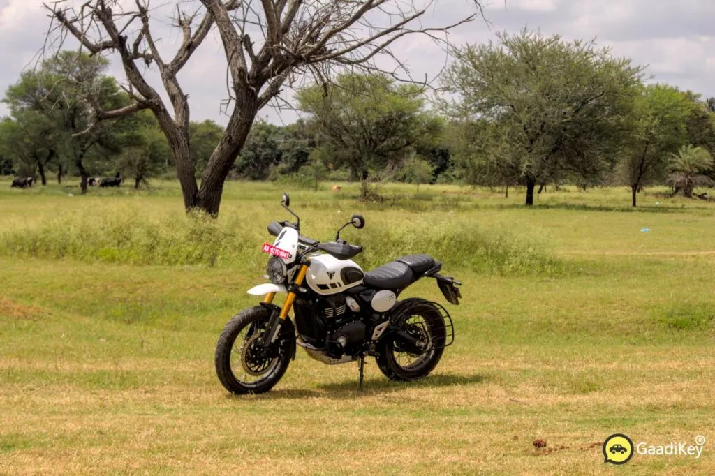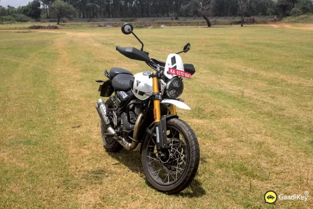 We got the new Triumph Scrambler 400XC in Vanilla White color option for a short ride in Bengaluru. Here are some photos of new Scrambler 400 XC in White color: